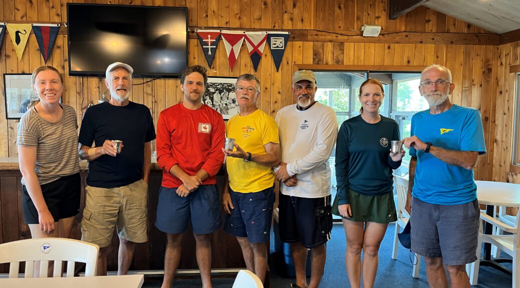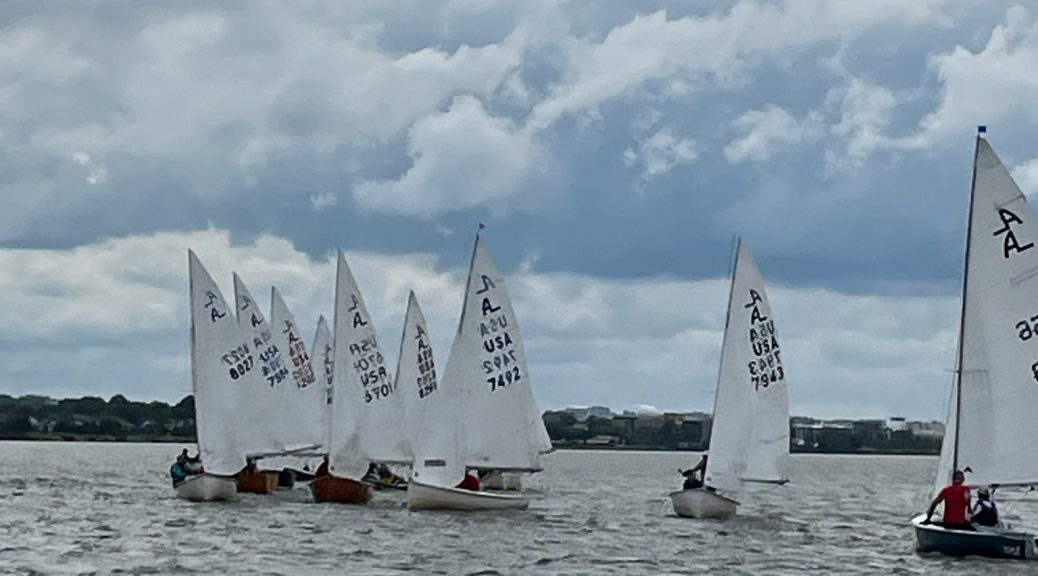 Thanks to some great timing by Mike, we had a fantastic start on the general recall, with a nice 10 boat lead for most of the leg. The shift did not come through the way we had hoped, and our lead evaporated a bit as boats that stayed on starboard were able to catch up. Then a comedy of errors involving a jib stick and a sticky mast put us back in seventh that race. (But Greg’s spaced-out move at the finish line took the cake, he claims, having snatched fifth place out of the jaws of 1st; Tyler and Eliza stepped into the right place at the right time, grabbed the bullet and ultimately, the regatta.)
